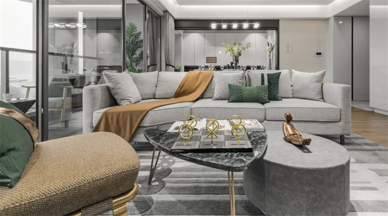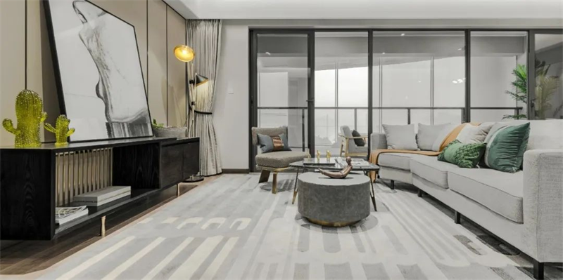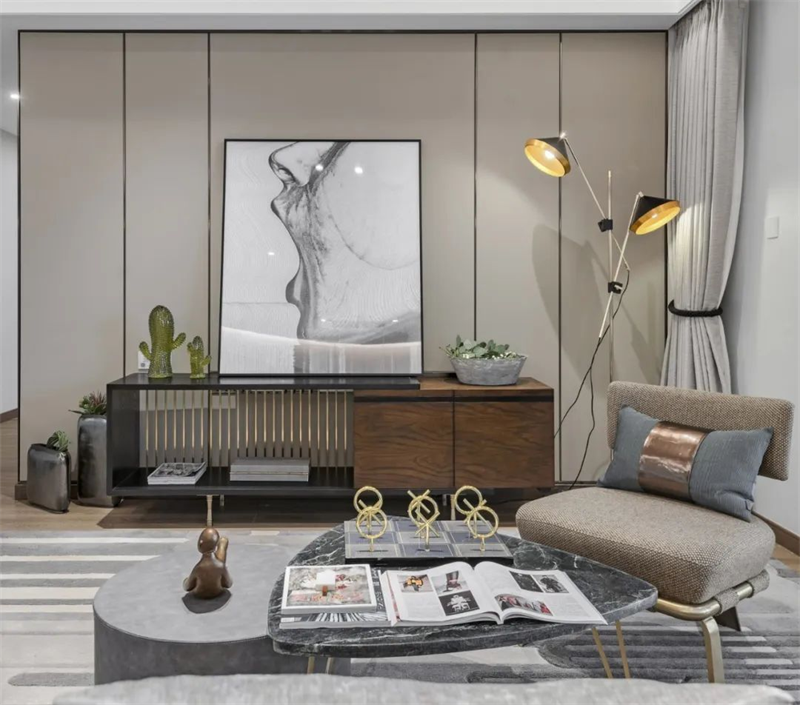 本案采用灰白中性色搭配原木地板為主色調(diào),營造清新簡約的空間氛圍。室內(nèi)家具選用了簡約設計的灰白色系,搭配金屬材質(zhì)的細節(jié)裝飾與綠植,使整體空間更顯現(xiàn)現(xiàn)代感和奢華感。