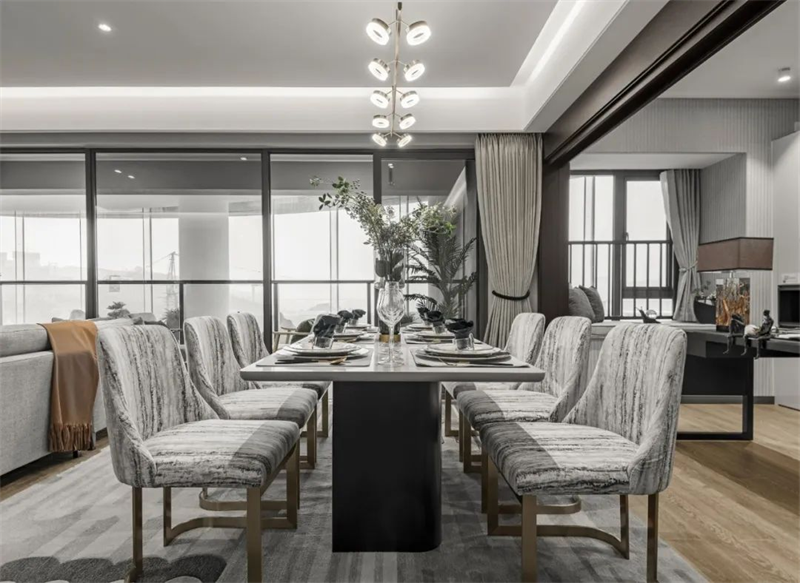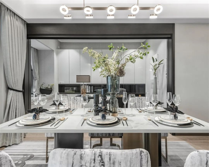 餐廳延續(xù)了客廳的風格,餐邊柜將定制柜的美觀與實用性發(fā)揮得淋漓盡致?,F(xiàn)代感十足的燈具將溫暖的光線投射到大理石餐桌和布藝餐椅上,營造出舒適的用餐氛圍。