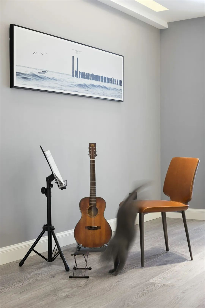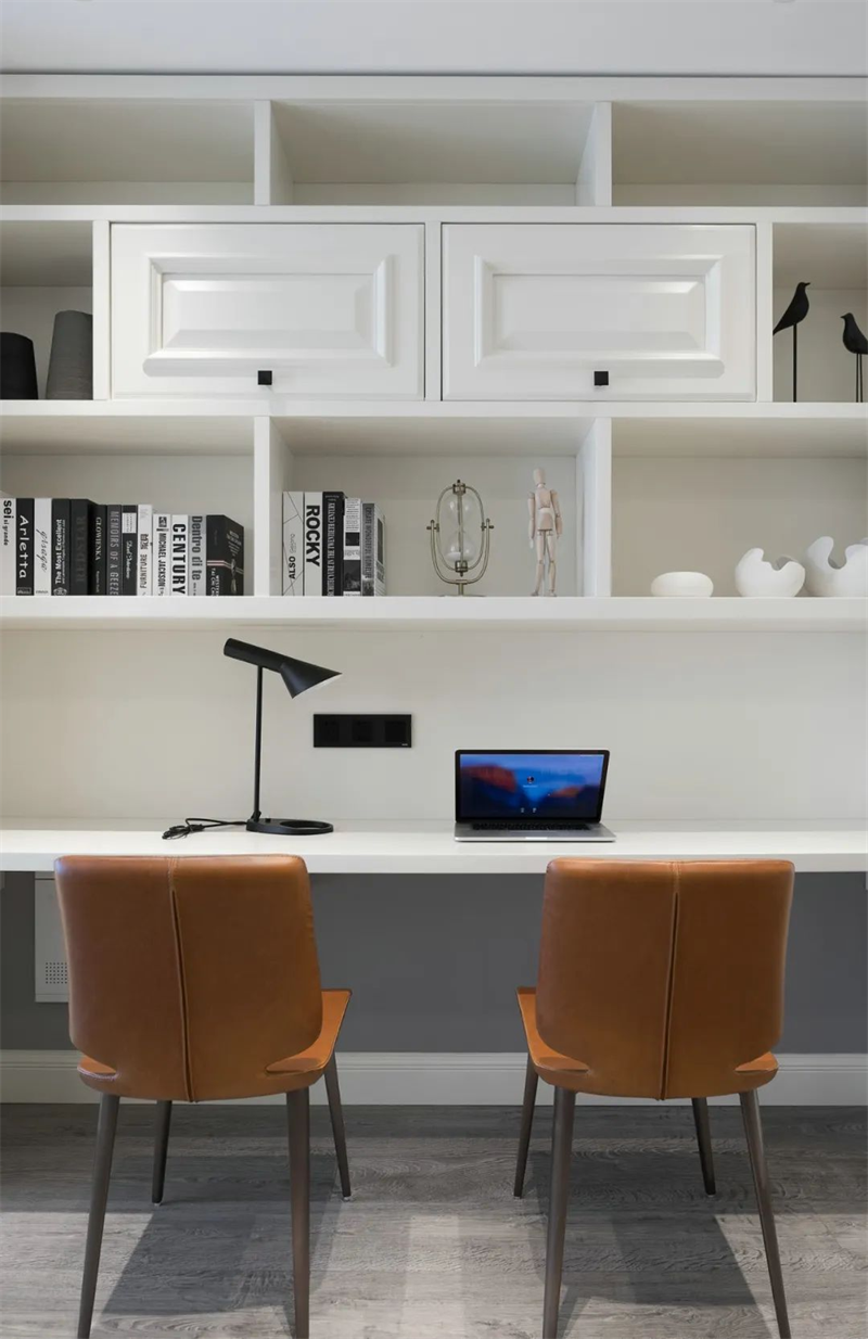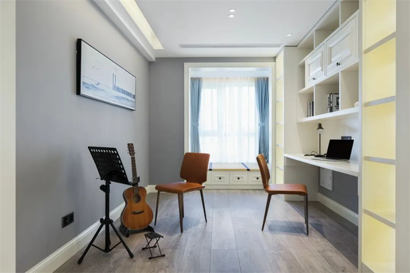 現(xiàn)代簡約的書房注重實用性和整體協(xié)調(diào)性。純白書桌和書架組合,打造出一個明快而整潔的學習空間。舒適的椅子、明亮的臺燈以及一些簡約的掛畫與樂器裝飾,讓這個空間兼具工作與休閑的功能。