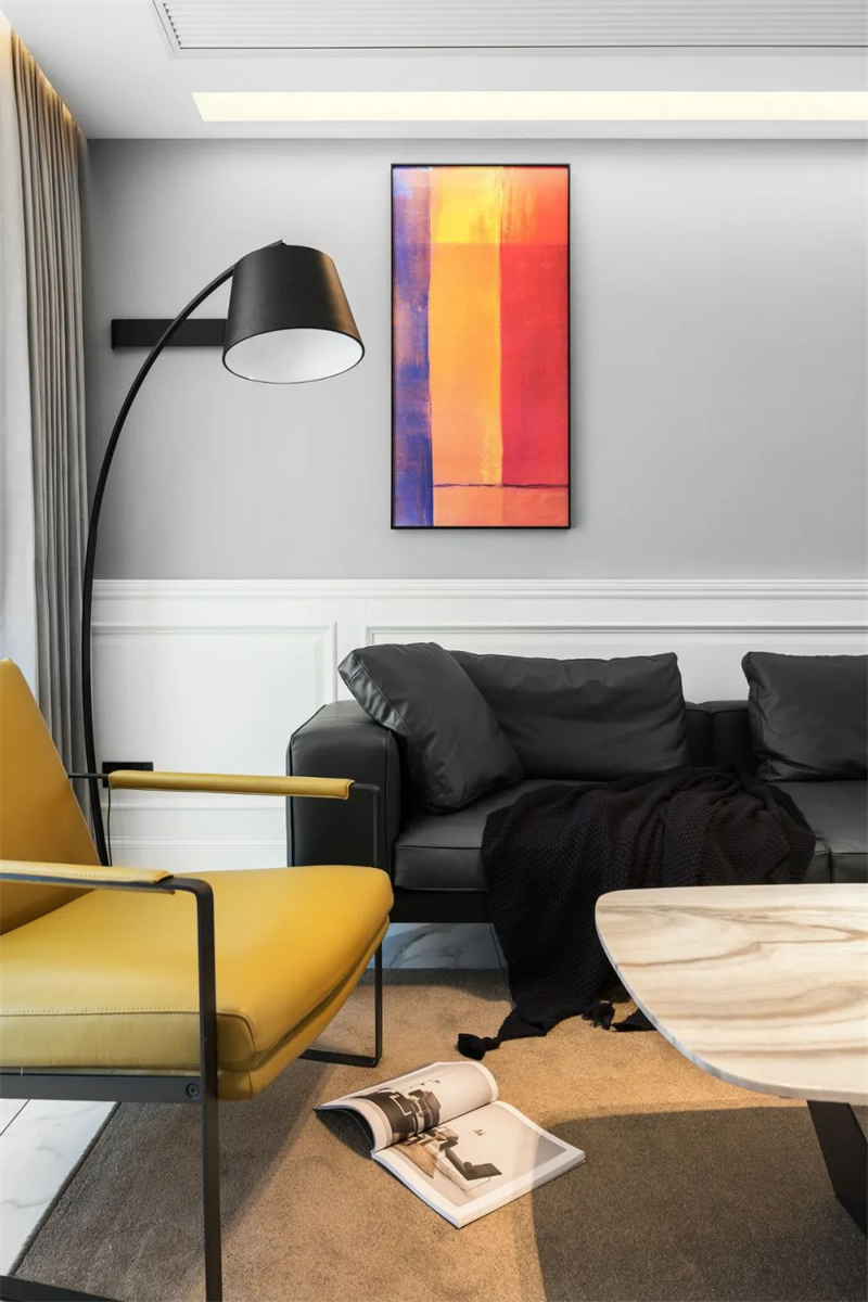 客廳主色調(diào)采用灰白墻面與白色大理石地磚搭配,創(chuàng)造出通透明亮的空間感。低調(diào)的深色調(diào)沙發(fā)展現(xiàn)簡約品味。通過一些精致的極簡設(shè)計裝飾畫和空間擺件,為整個客廳注入一絲藝術(shù)氛圍。